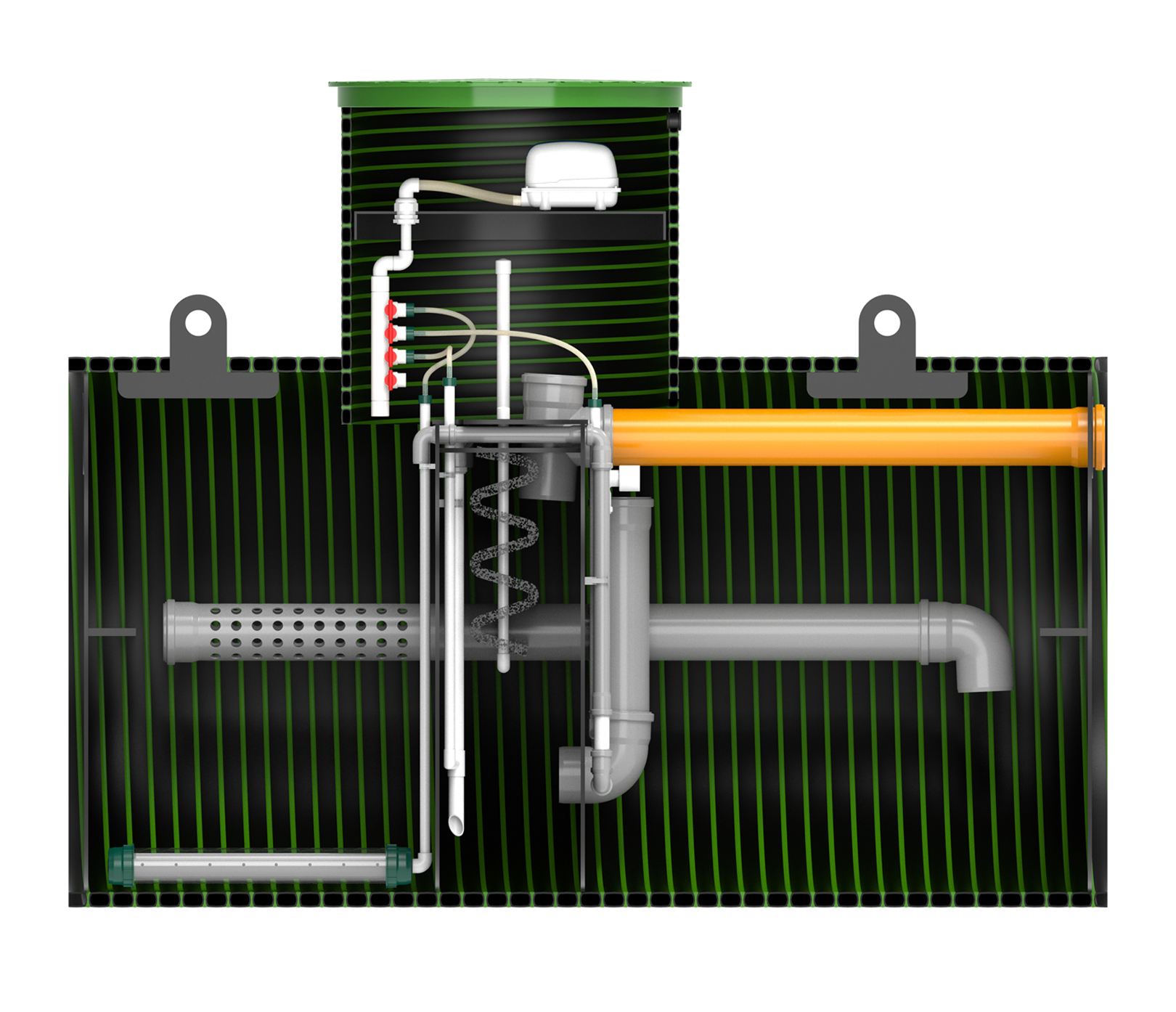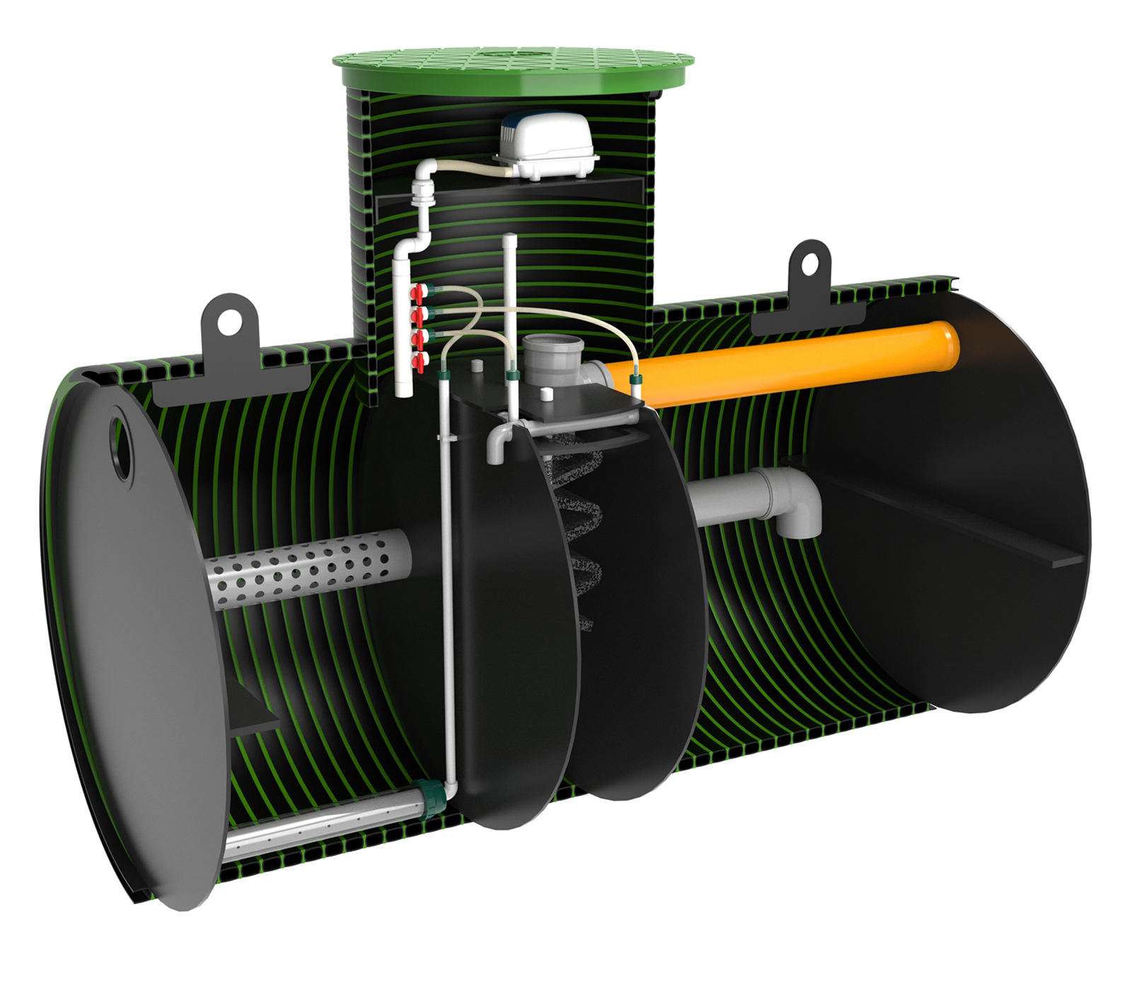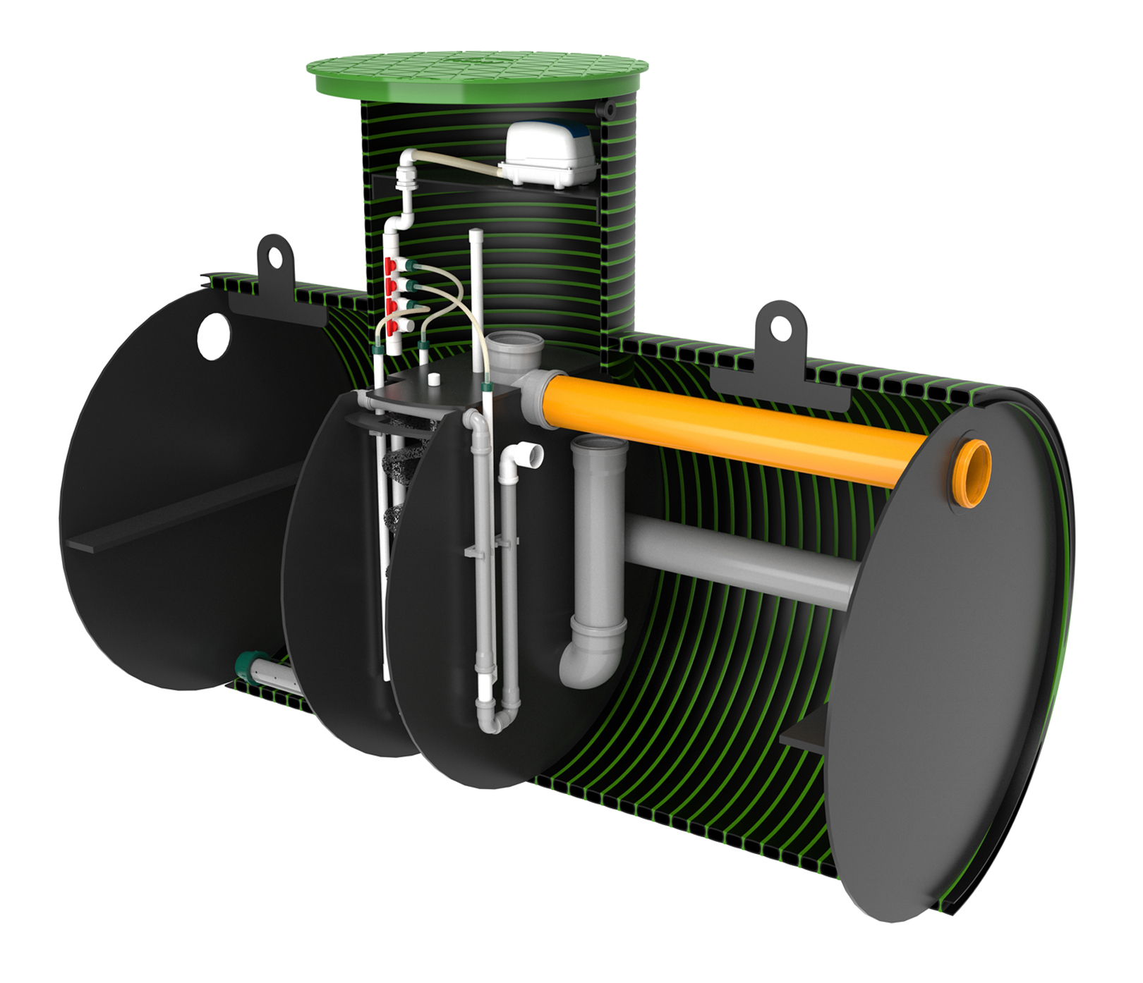 Горизонтальные станции биологической очистки KANNсерии ECOимеют производительность от 400 до 900 л/сутки и рассчитаны на количество проживающих от 2 до 6 человек. Принцип работы септика основан не мелко-пузырчатой аэрации, которую создает аэрационная установка, поставляемая в комплекте. За счет подачи воздуха в станцию, а также дополнительных механизмов очистки происходит полная очистка стоков до уровня 98%. Полученная на выходе вода на выходе не имеет запаха, прозрачна и бесцветна. Такую воду можно дренировать в грунт.