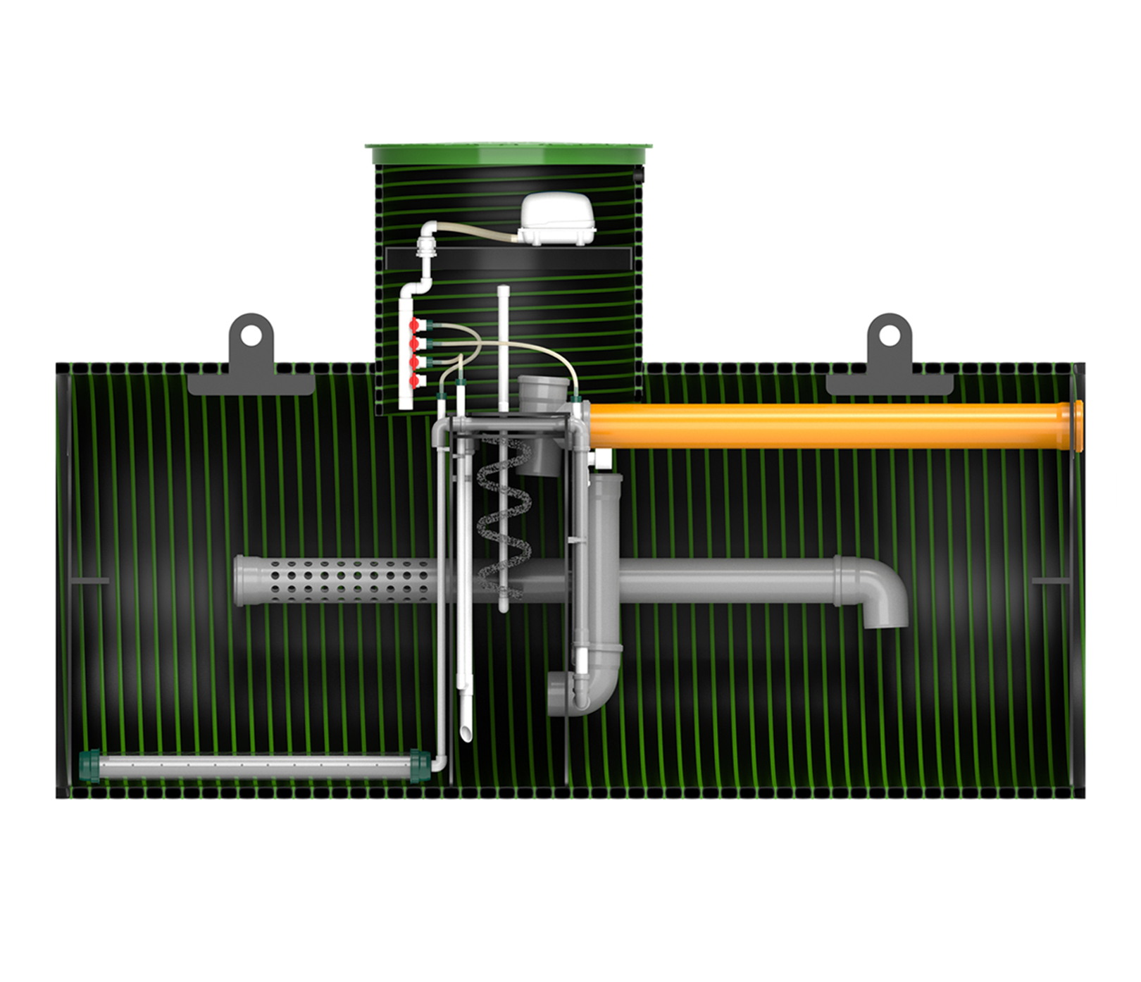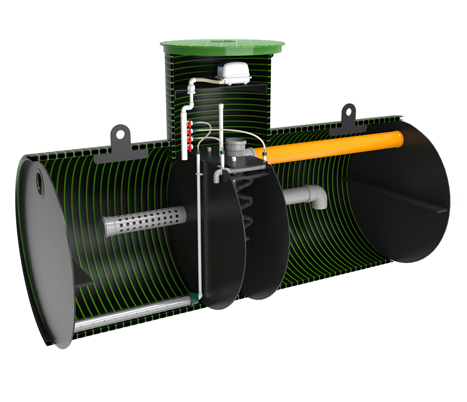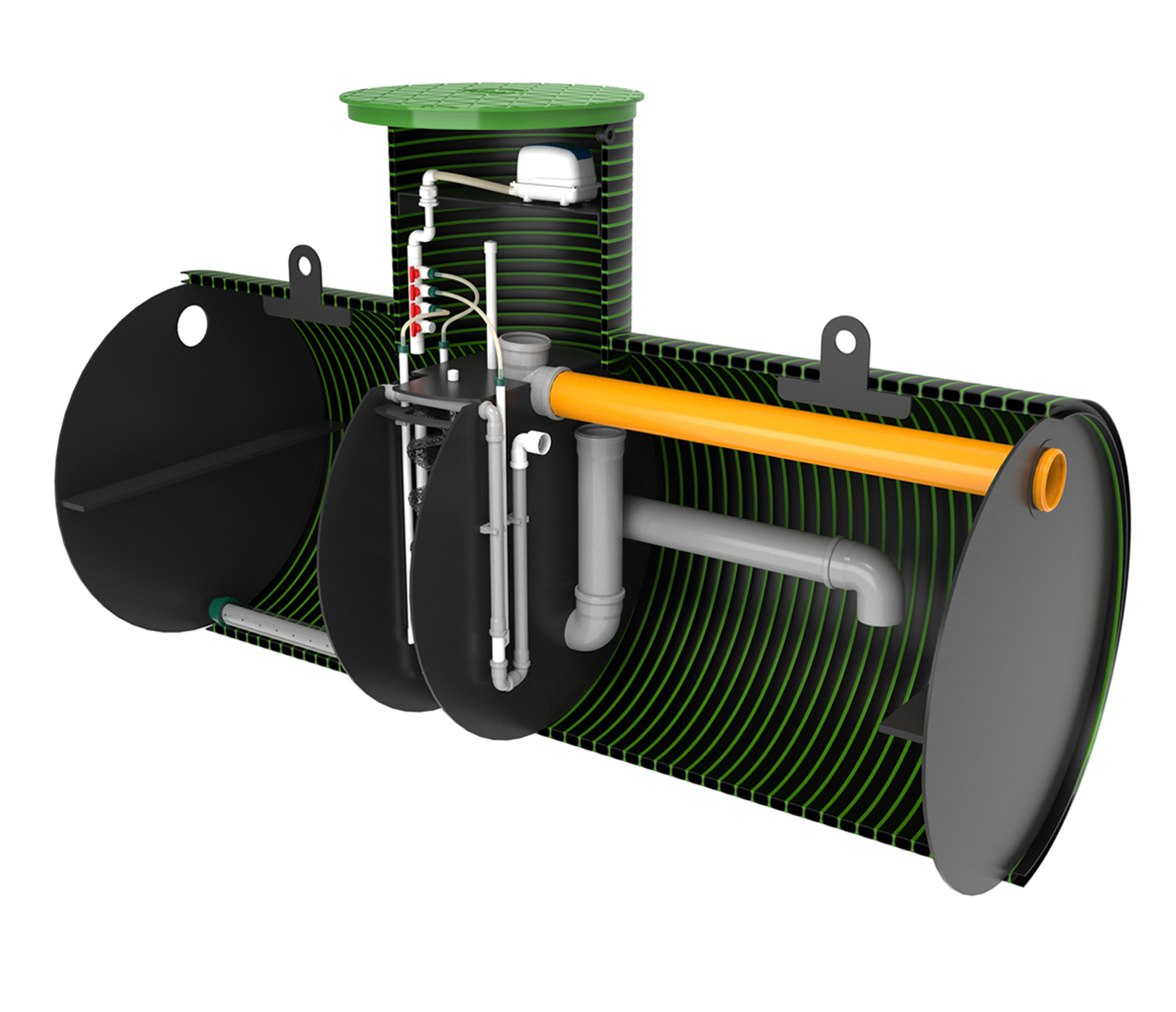 Горизонтальные станции биологической очистки KANNсерии ECO имеют производительность от 400 до 900 л/сутки и рассчитаны на количество проживающих от 2 до 6 человек. Принцип работы септика основан не мелко-пузырчатой аэрации, которую создает аэрационная установка, поставляемая в комплекте. За счет подачи воздуха в станцию, а также дополнительных механизмов очистки происходит полная очистка стоков до уровня 98%. Полученная на выходе вода на выходе не имеет запаха, прозрачна и бесцветна. Такую воду можно дренировать в грунт.