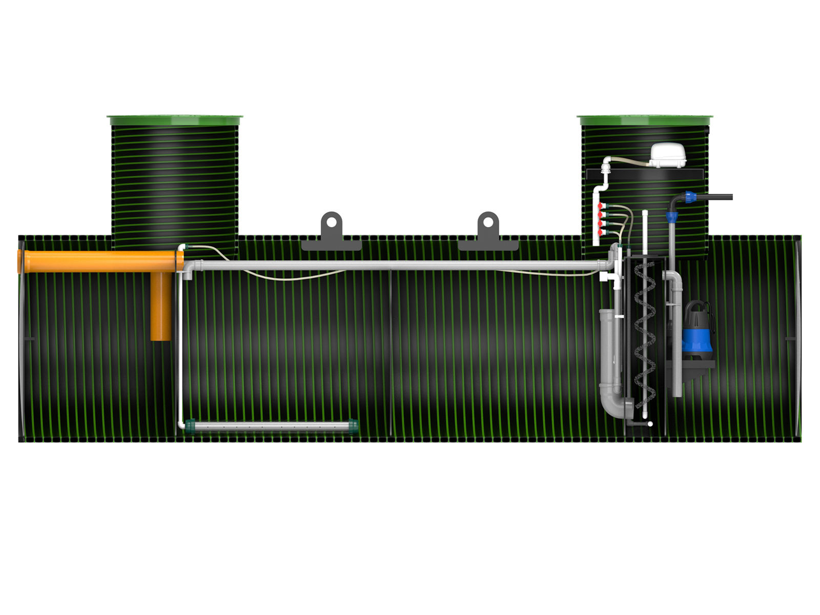 Горизонтальные станции биологической очистки KANNсерии ULTRA имеют производительность от 1000 до 2000 л/сутки и рассчитаны на количество проживающих от 5 до 10 человек. Принцип работы септика основан не мелко-пузырчатой аэрации, которую создает аэрационная установка, поставляемая в комплекте. За счет подачи воздуха в станцию, а также дополнительных механизмов очистки происходит полная очистка стоков до уровня 98%. Полученная на выходе вода на выходе не имеет запаха, прозрачна и бесцветна. Такую воду можно дренировать в грунт.